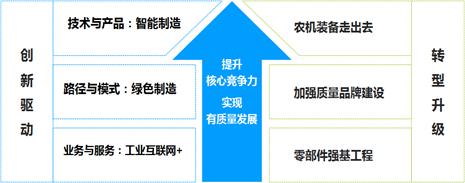 在此背景下,2015年5月國(guó)務(wù)院正式印發(fā)了我國(guó)實(shí)施制造強(qiáng)國(guó)戰(zhàn)略第一個(gè)十年的行動(dòng)綱領(lǐng)——《中國(guó)制造2025》?!吨袊?guó)制造2025》以信息技術(shù)與制造技術(shù)深度融合的數(shù)字化網(wǎng)絡(luò)化智能化制造為主線,以五大工程(即:國(guó)家制造業(yè)創(chuàng)新中心建設(shè)工程、智能制造工程、工業(yè)強(qiáng)基工程、綠色發(fā)展工程、高端制造創(chuàng)新工程)為抓手,以十大重點(diǎn)領(lǐng)域?yàn)橥黄瓶?,全面部署了制造?qiáng)國(guó)戰(zhàn)略行動(dòng)路線圖。農(nóng)機(jī)裝備被列為十大重點(diǎn)領(lǐng)域之一,為農(nóng)業(yè)機(jī)械產(chǎn)業(yè)發(fā)展提供了新的契機(jī)。中國(guó)制造2025中明確提出,農(nóng)機(jī)裝備以提高農(nóng)機(jī)裝備信息收集、智能決策和精準(zhǔn)作業(yè)能力,形成面向農(nóng)業(yè)生產(chǎn)的信息化整體解決方案為發(fā)展目標(biāo),以滿足大宗糧食和戰(zhàn)略性經(jīng)濟(jì)作物生產(chǎn)過(guò)程所需要的先進(jìn)農(nóng)機(jī)裝備為發(fā)展重點(diǎn),加快發(fā)展大型拖拉機(jī)及其復(fù)式作業(yè)機(jī)具、大型高效聯(lián)合收割機(jī)等高端農(nóng)業(yè)裝備及關(guān)鍵核心零部件。中國(guó)制造2025為未來(lái)十年我國(guó)農(nóng)機(jī)裝備發(fā)展指明了方向和重點(diǎn)。農(nóng)機(jī)制造2025具體實(shí)現(xiàn)路徑應(yīng)該是我們農(nóng)機(jī)界深入研究的主題。